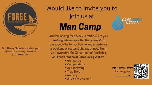 April 10-12-Join other men and experience a weekend of rest and change of pace from your everyday life. Get a taste of God in his word and creation at Camp Living Waters! Cost $130 per person