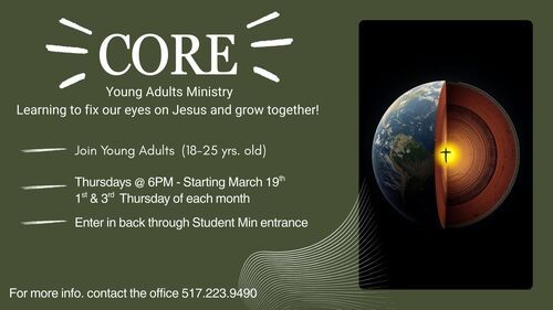 Join our Young Adults Ministry on the 1st and 3rd Thursday of each month starting March 19th as we learn together, grow in our faith, and keep our eyes fixed on Jesus.