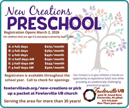 Tuition is calculated at an annual rate and divided into 9 equal payments for the corresponding school year. This annual rate can be paid in one lump sum at the beginning of the school year or a parent/guardian can choose to pay in nine monthly installments (September through May). Payments can be made by cash or check by placing your payment in the black payment box located on the wall as you exit the preschool hallway, or by credit or debit card through the link you receive. Checks can be made out to Fowlerville UB Church. Please include the child’s name in the memo line.